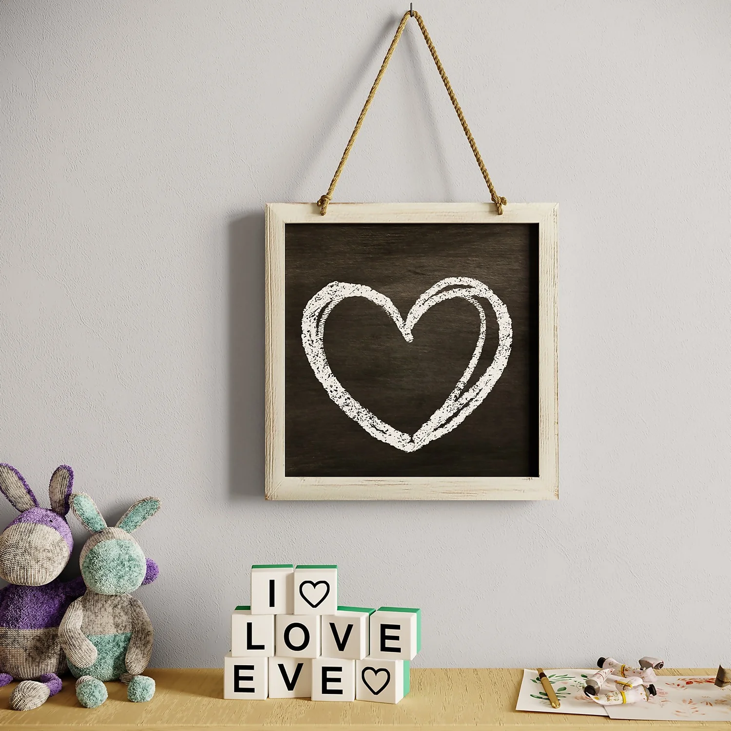The Kids Chalkboard features a 300x300mm frame with ample drawing and writing space. The white paint finish and stylish hanging rope combine for an on-trend and fun design that can be easily hung anywhere in the home. Use in the kids play area or bedroom for drawing and encourage their creativity. Alternatively, use in the kitchen or living room or home entryway for shopping lists, reminders or home greeting messages.